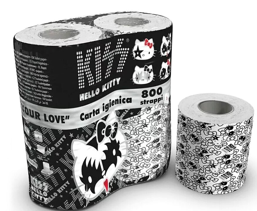 Но най-абсурдни са тоалетната хартия "KISS x Hello Kitty" и тематичният KISS ковчег. В два от въпросните ковчези са били погребани легендарните братя от Pantera - Вини Пол и Даймбег Дарел.
