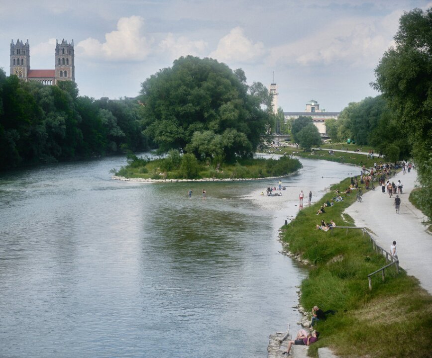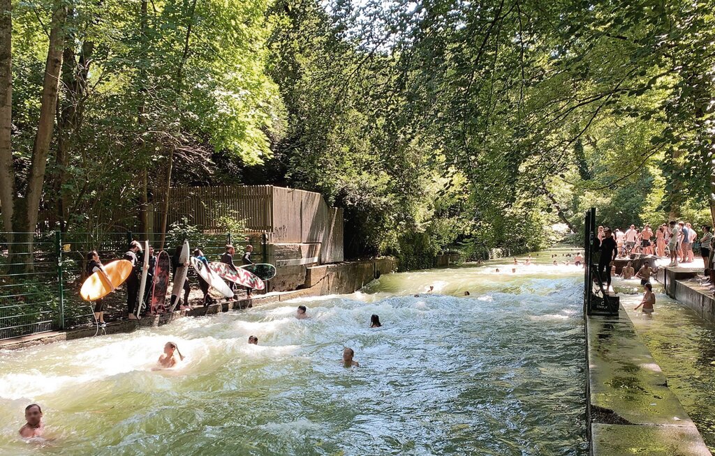 Градът не разчита само на река Изар, а на цяла система от по-малки канали и водни разклонения, които преминават през паркове и квартали. Част от тях са превърнати в линейни зелени пространства с алеи, места за спорт и дори зони за плуване. В горещите месеци тези водни коридори се превръщат в естествени "охладители" на града – място, където хората не просто минават, а прекарват свободното си време.