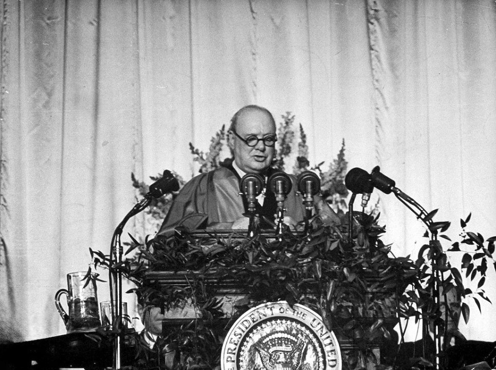 В речта си на 5 март 1946 г. той начертава метафоричната разделителна линия през Европа и призовава САЩ да погледнат навън и да се противопоставят на връщането към изолационизма.