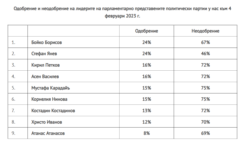 Данните на Екзакта показват, че недоверието към цялата политическа класа е огромно. Едва 7% от българите одобряват работата на Народното събрание, а при лидерите на водещите политически сили неодобрението се движи в диапазона между 67% и 75% и надхвърля в пъти одобрението.