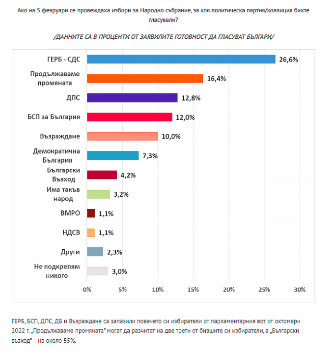 „Въпреки възможността на предстоящите избори да се гласува и с хартиена бюлетина, 88% от българите допускат, че до урните през април т.г. ще отидат по-малко хора в сравнение с тези, които гласуваха на парламентарния вот през октомври 2022 г.“