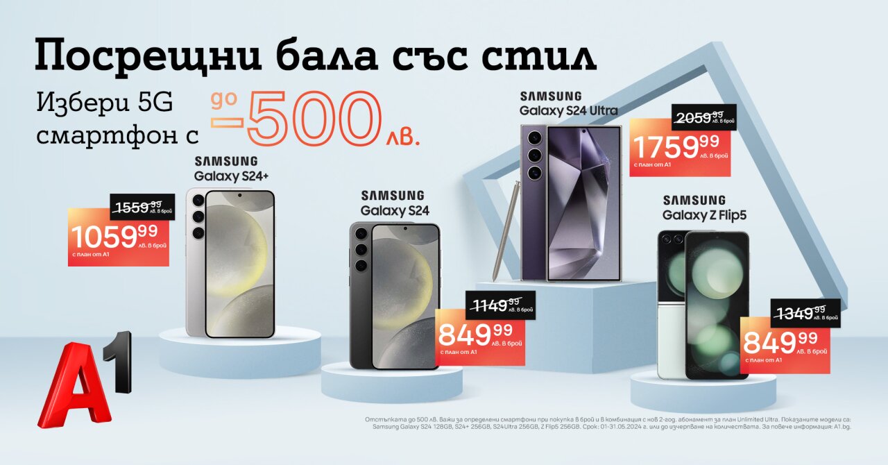 Част от промоционалната кампания на А1 през май са и Samsung Galaxy S24+, Samsung Galaxy Flip4, Samsung Galaxy Fold4, Samsung Galaxy S23+ и Samsung Galaxy S23 Ultra, като всеки от тях може да бъде закупен на специална цена с отстъпка до 500 лева.