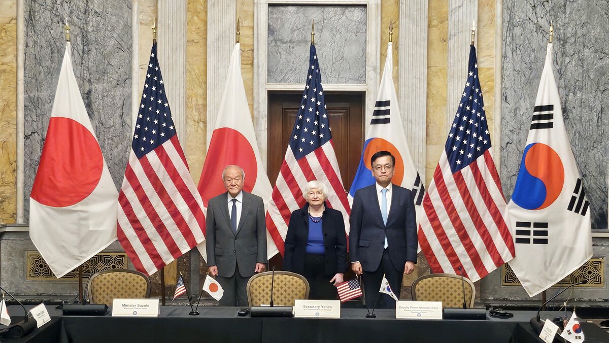 Тристранната среща очертава балансът, който Токио и Сеул се опитват да постигнат като косвени участници в съществуващата икономическа и военна конкуренция между Вашингтон и Пекин.