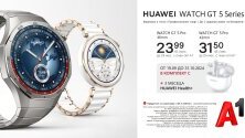 Всички модели са съвместими с iOS и Android, а до края на месеца идват в комплект с безжични слушалки Huawei FreeBuds 5i, както и 3 месеца безплатно ползване на услугата HUAWEI Health+ при поръчка от А1. Huawei Watch GT5 Pro 46mm Titanium е достъпен на лизинг срещу 23,99 лева на месец с план Unlimited Ultra от А1, а Huawei GT5 41mm Gold Millanese срещу 10,50 лева на месец със същия план.